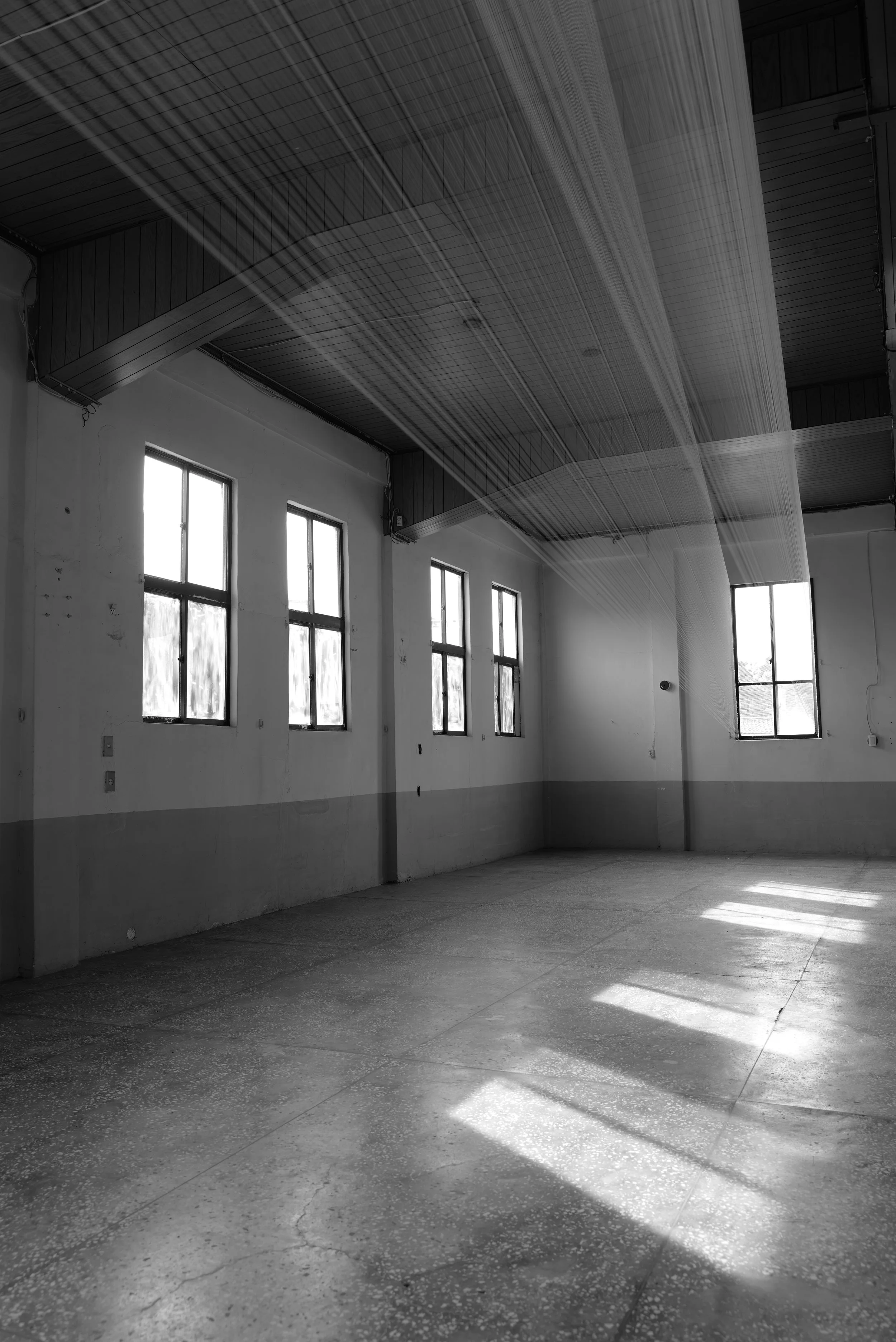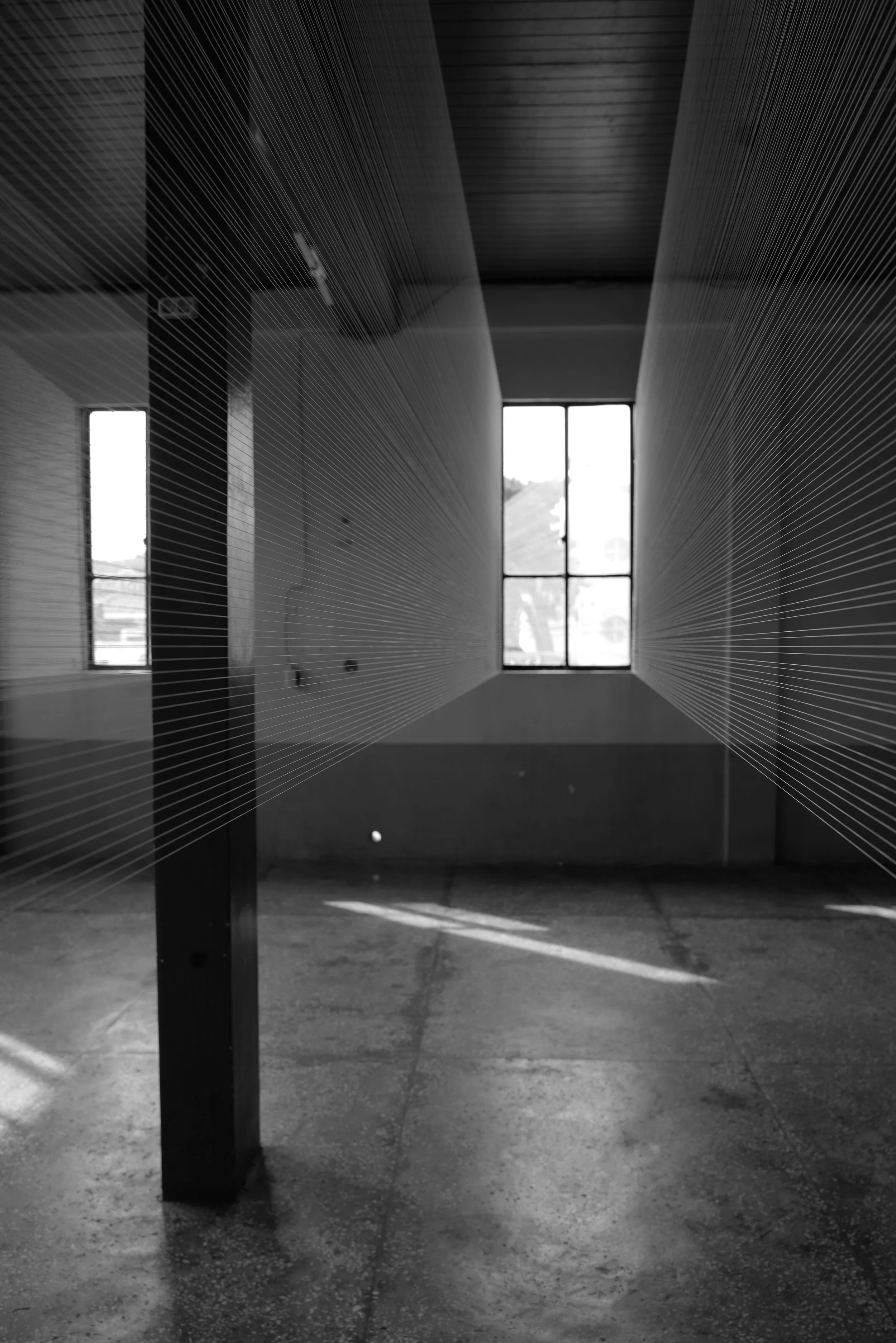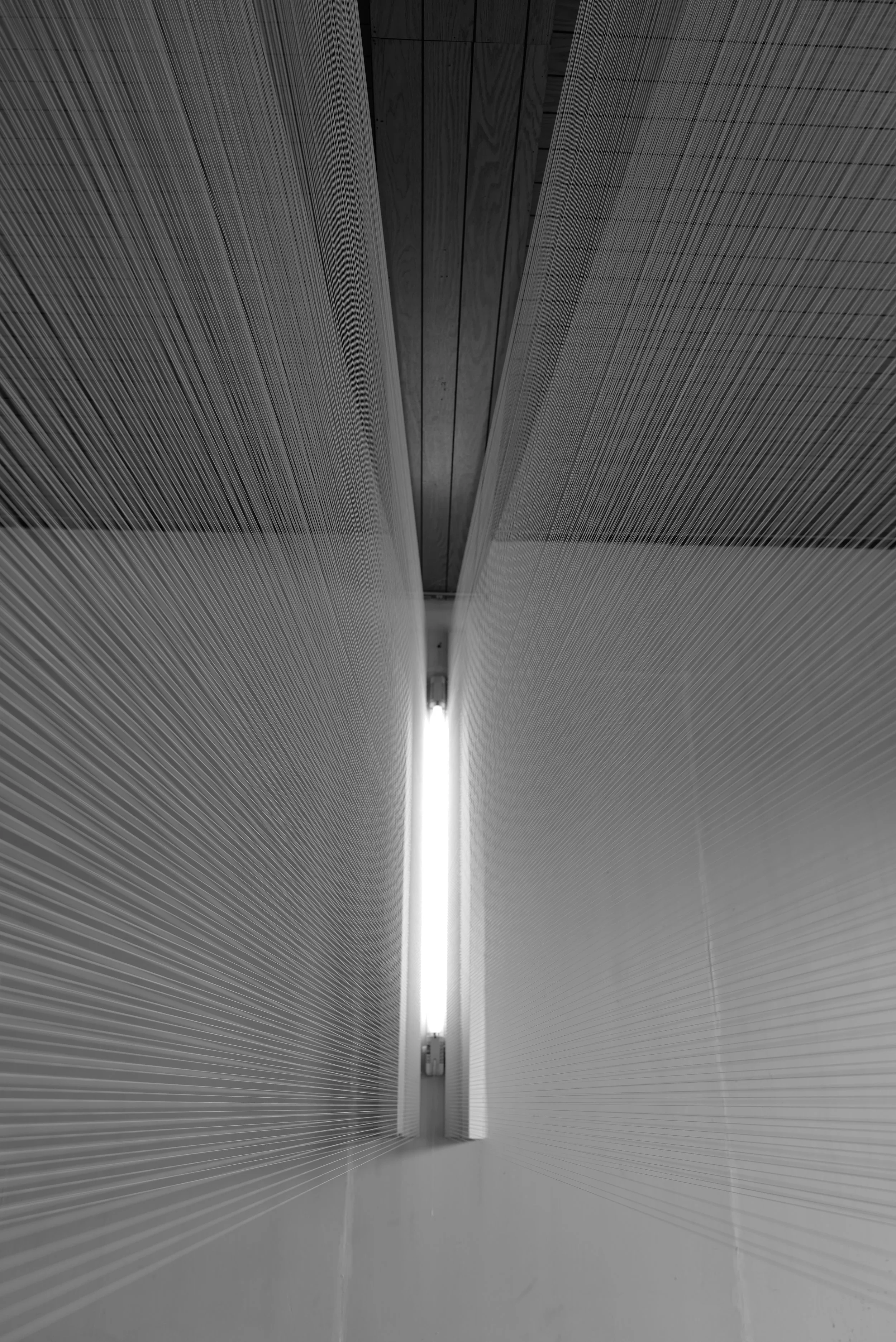 The vacant building is transformed another time with the site responsive installation And to Flounder in this Sea is Sweet to Me. The threads, emitting from a church light source, extend along the whole empty space towards the two windows at the far end wall of the building, and the outdoor terrace. Shono, responds to this space of multilayered narratives with a complex but at the same time delicate, tangible and light structure.